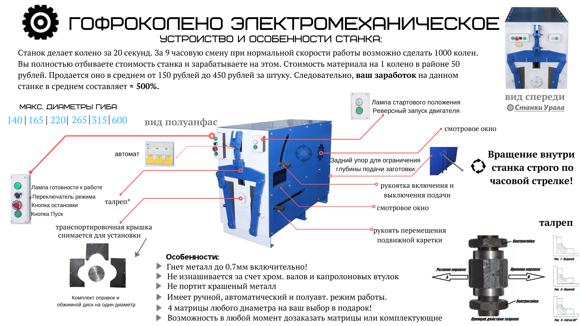 Диапазон диаметров труб от 60-600мм. 4 матрицы и оправки уже в комплекте к станку бесплатно!